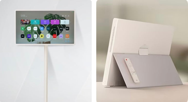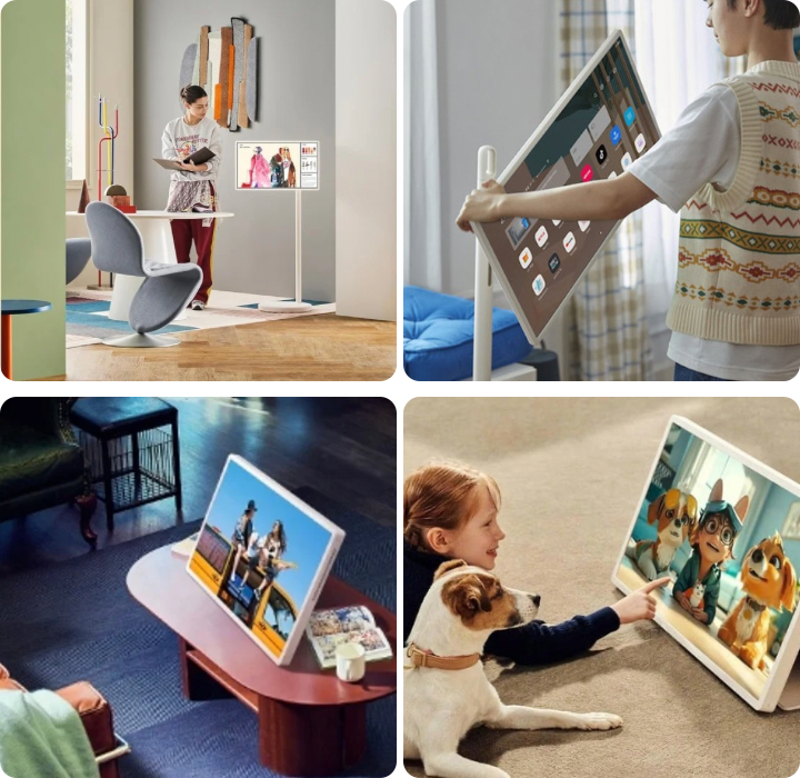 Rollen Sie den Bildschirm mithilfe des verstellbaren Rollständers. Nehmen Sie ihn ab und stellen Sie ihn wie ein Tablet mit Schutzhülle auf ein Möbelstück.